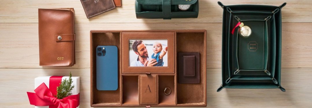 Celebrate his professional accomplishments along with him by designing personalized leather wallets, laptop folios and portfolios with his monogram. Check out the wide selection of ties, dress socks and handkerchiefs to help him look the part as well. Of course, every professional needs a place to go with all his accessories, so outfit his dresser with a leather catchall, valet, or watch box and getting dressed will be a snap.