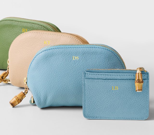If you've got a fashion lover on your list, give them a leather card case in an unexpected colour like orchid or kelly green. The outer slot is designed to hold cards to which you need quick and easy access, while the interior pouch is good for keeping cash. Foil debossed monogramming adds a special touch to this stylish, functional item. Match it with a monogrammed leather pouch in the same hue, which can be used to carry change or other small items.