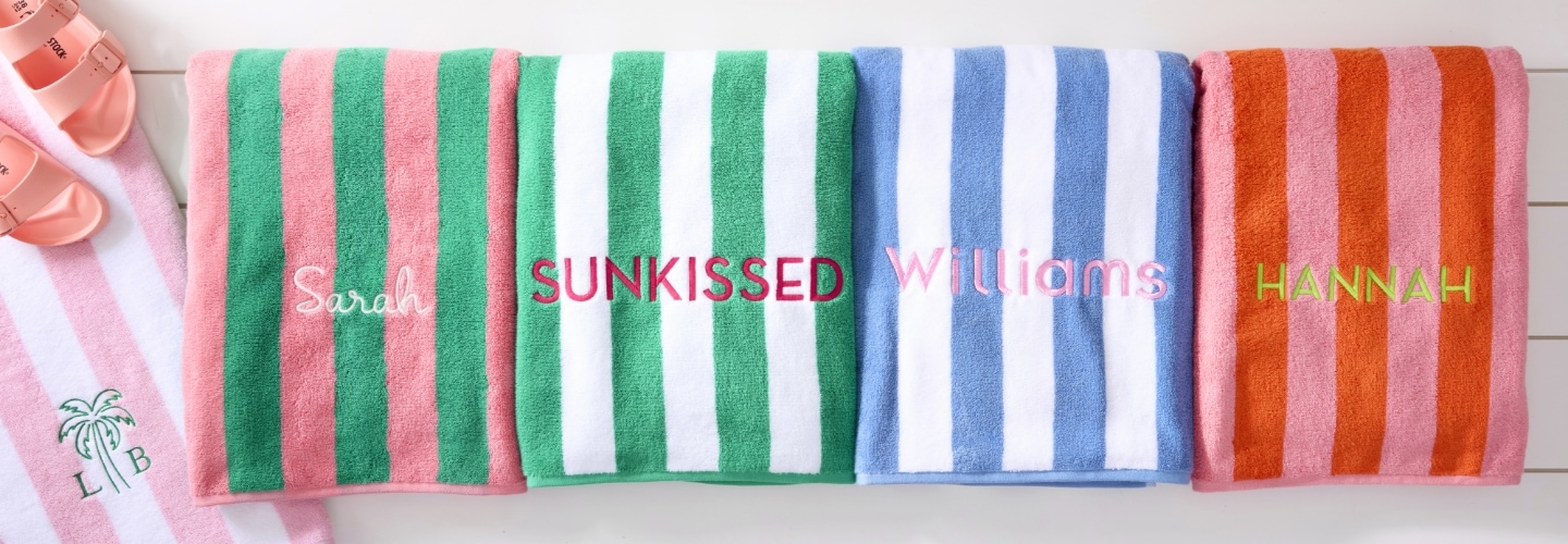 - Towels. Let's face it: there's nothing like a bright and cheery beach towel to give your outdoor experience a playful feel. Browse our selection of towels featuring colourful stripes complete with a fringe trim for boho-inspired flair. We've even got a kids' hooded beach towel designed to match yours. Personalize with your name and initials for an extra-special touch.